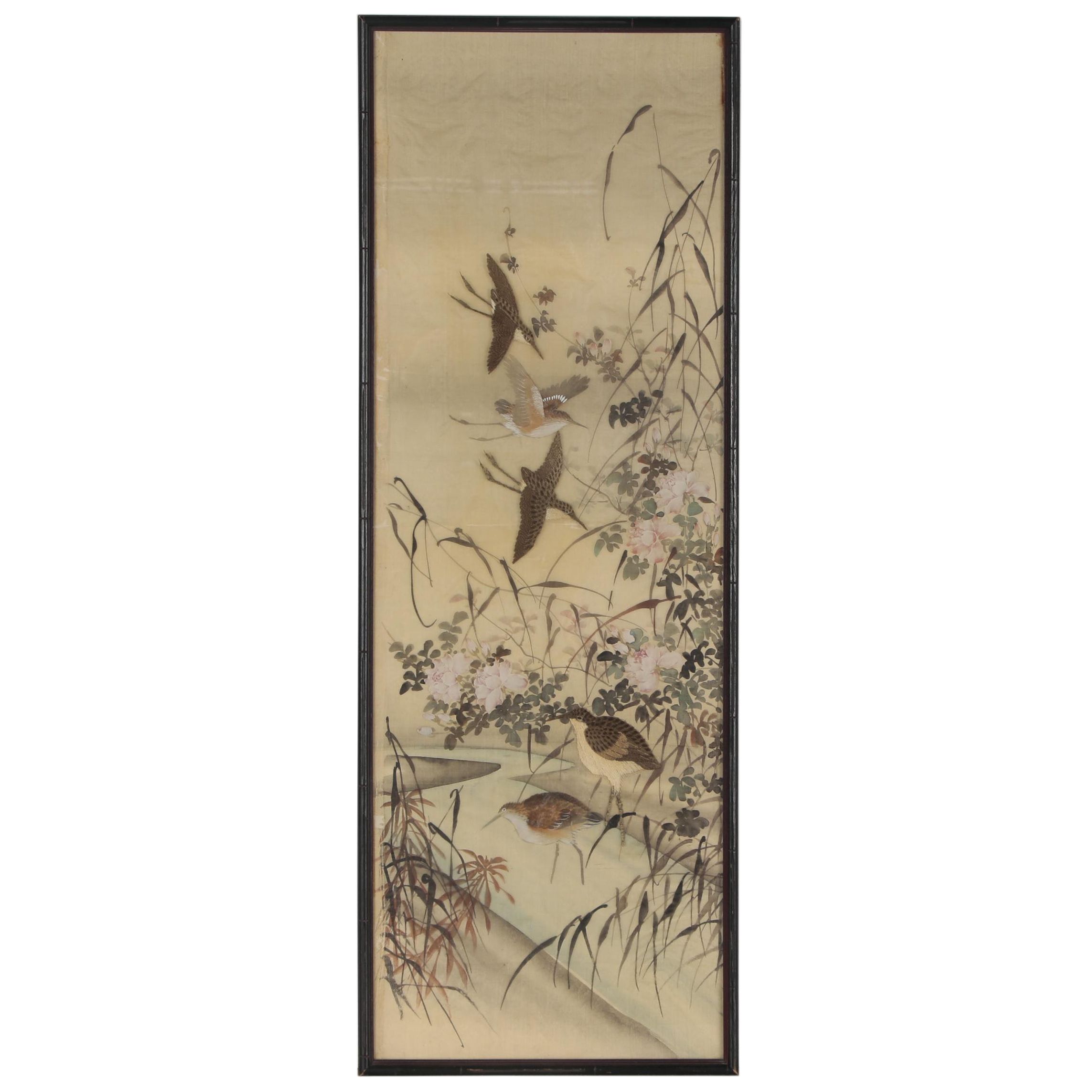 East Asian Bird And Flower Silk Screen Panel Early 20th Century