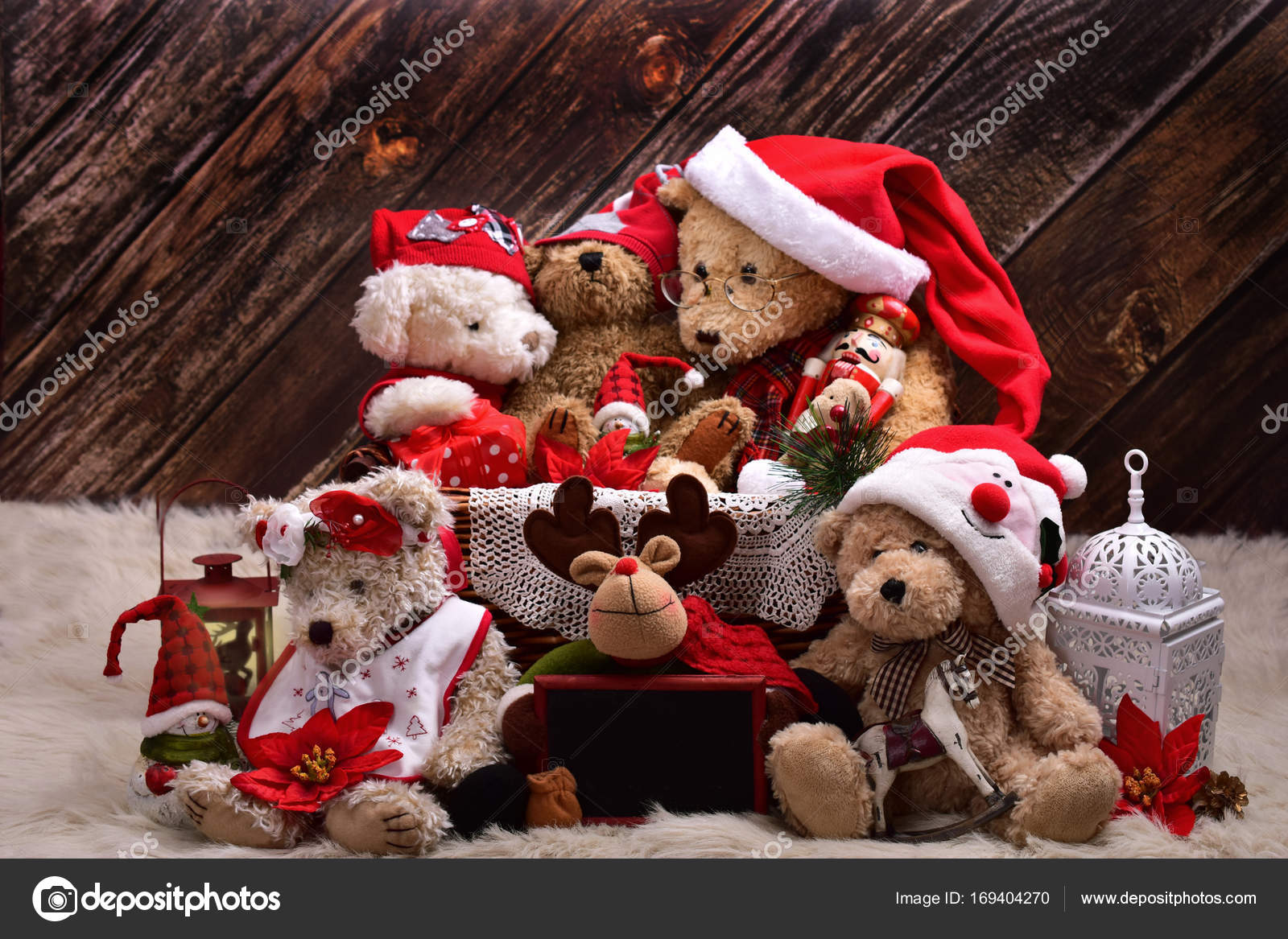 A Team From Teddy Bears For Christmas On A Wooden Background Stock