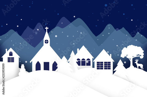 Illustration Of Christmas Winter Night Over A Snow Covered Village