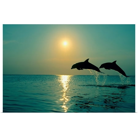 Great Big Canvas Pair Of Bottle Nose Dolphins Jumping At Sunset