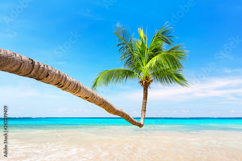 Coconut Palm Tree Against Blue Sky And Beautiful Beach In Punta