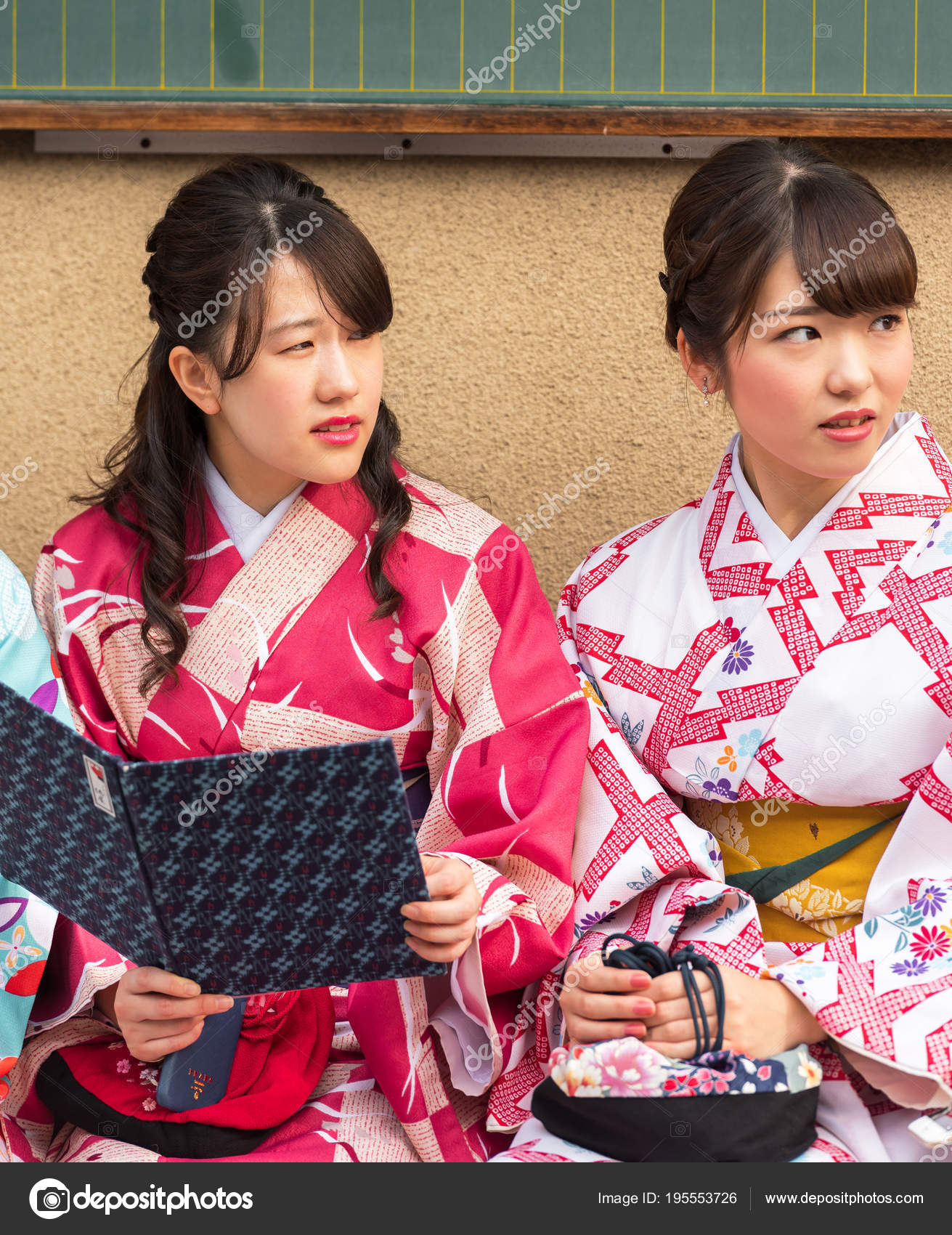 Two Japanese Girls Wearing Kimonos Traditional Clothes Lifestyle