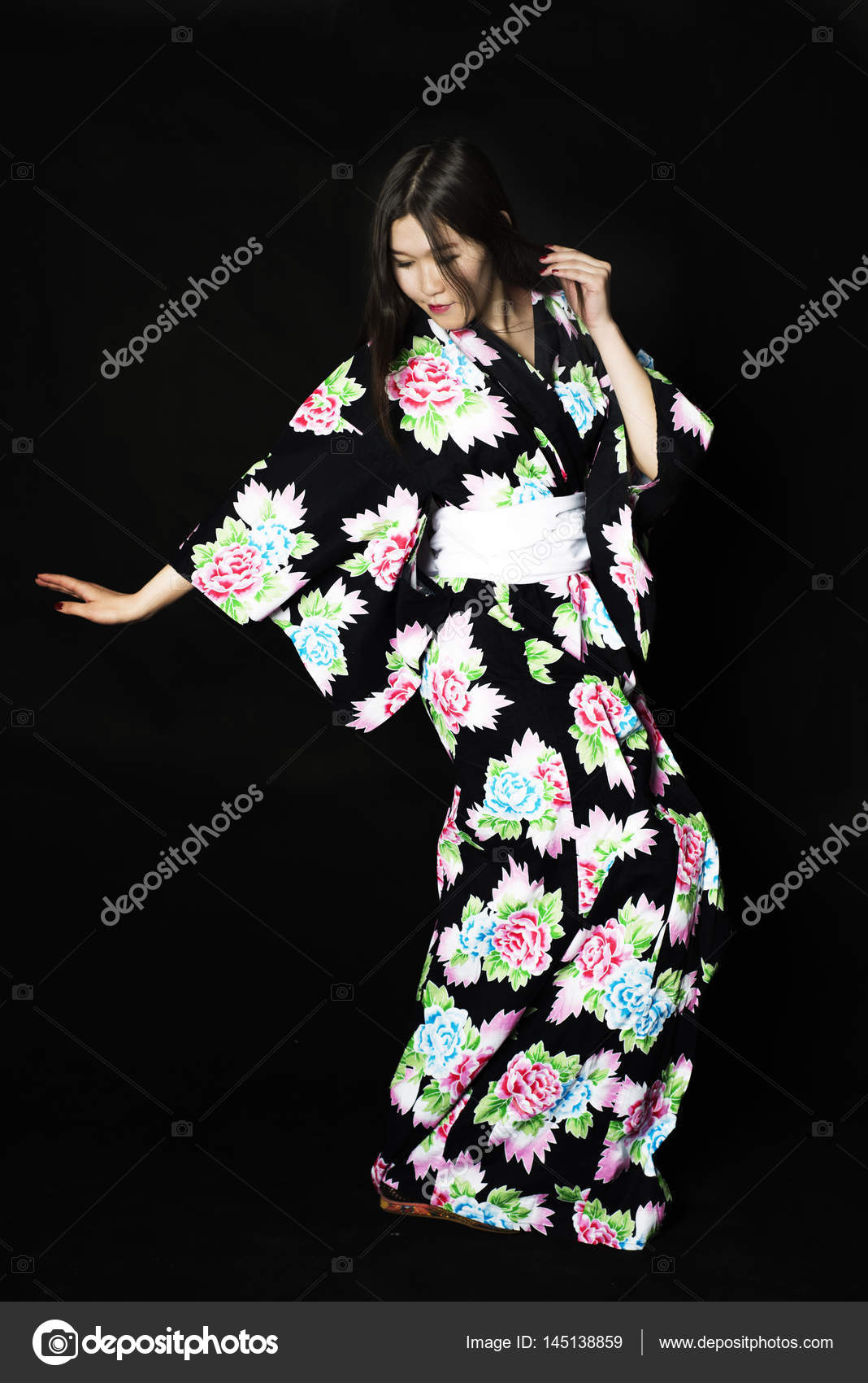 Japanese Girl In Traditional Japanese Kimono On Black Background