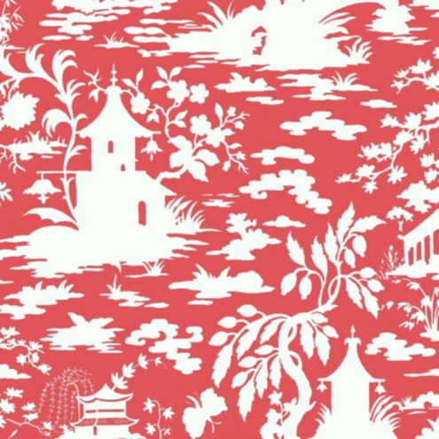 Asian Scenic Toile Wallpaper Salmon Pink White Double Roll