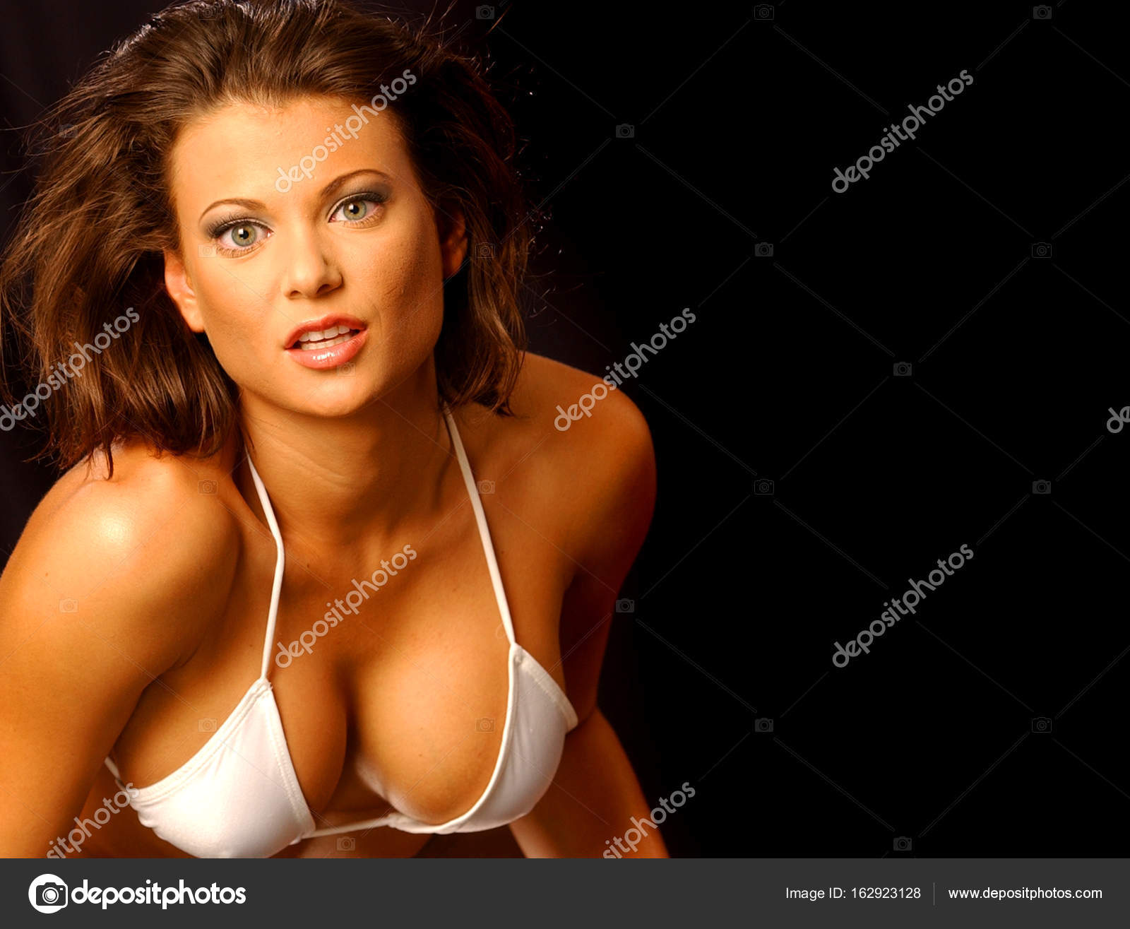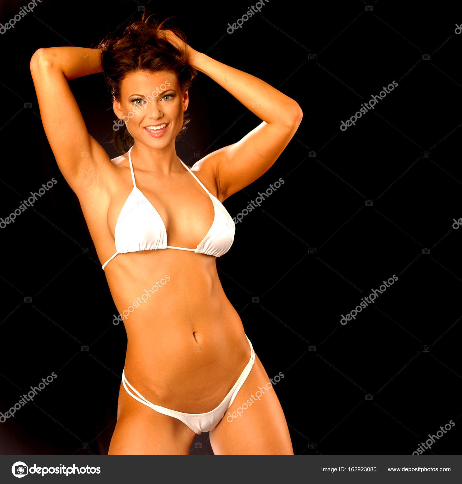 Black Wallpaper Sexy Brunette Skimpy Bikini Stock Photo