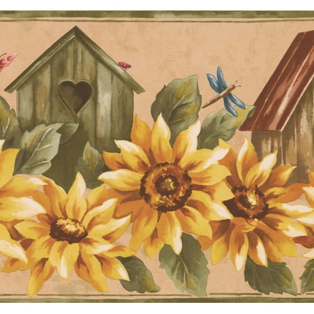Yellow Sunflower And Birdhouse Floral Wallpaper Border Retro