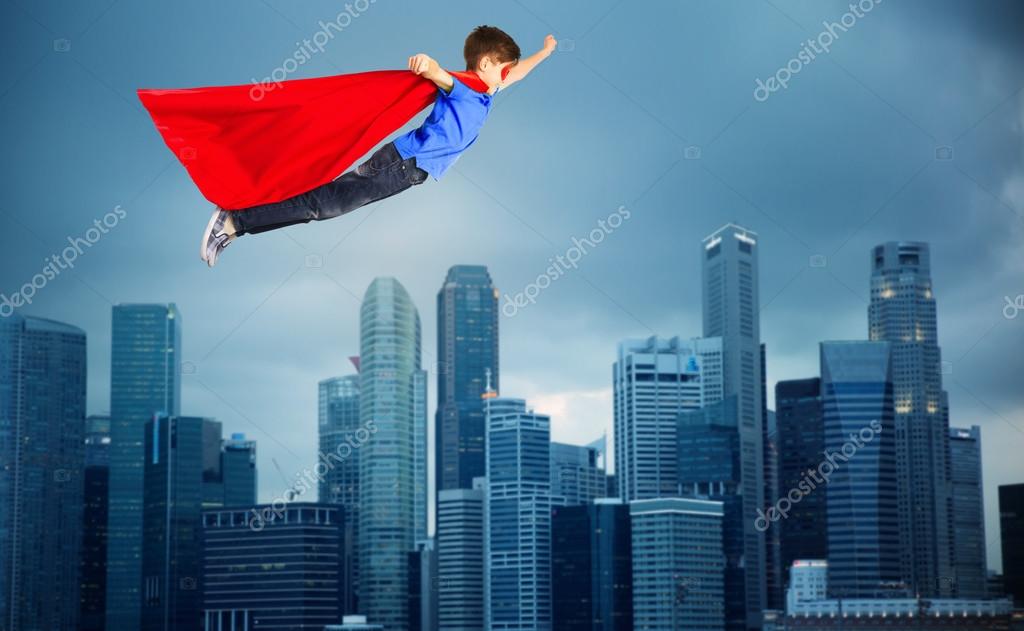 Boy In Red Superhero Cape Flying Over City Stock Photo