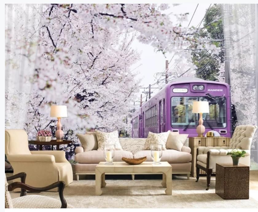 Train Cherry Blossom Tv Background Wall Beautiful Scenery