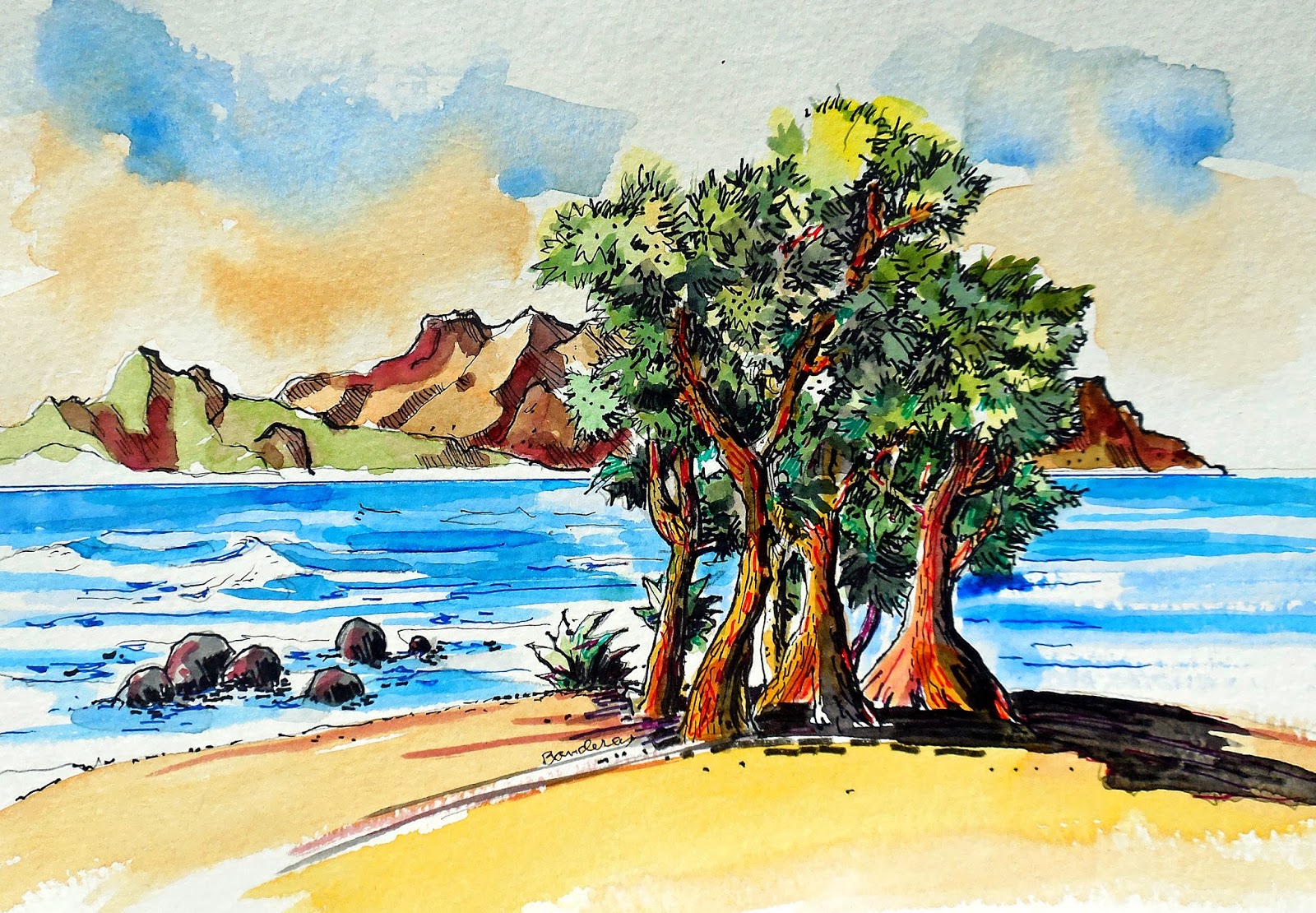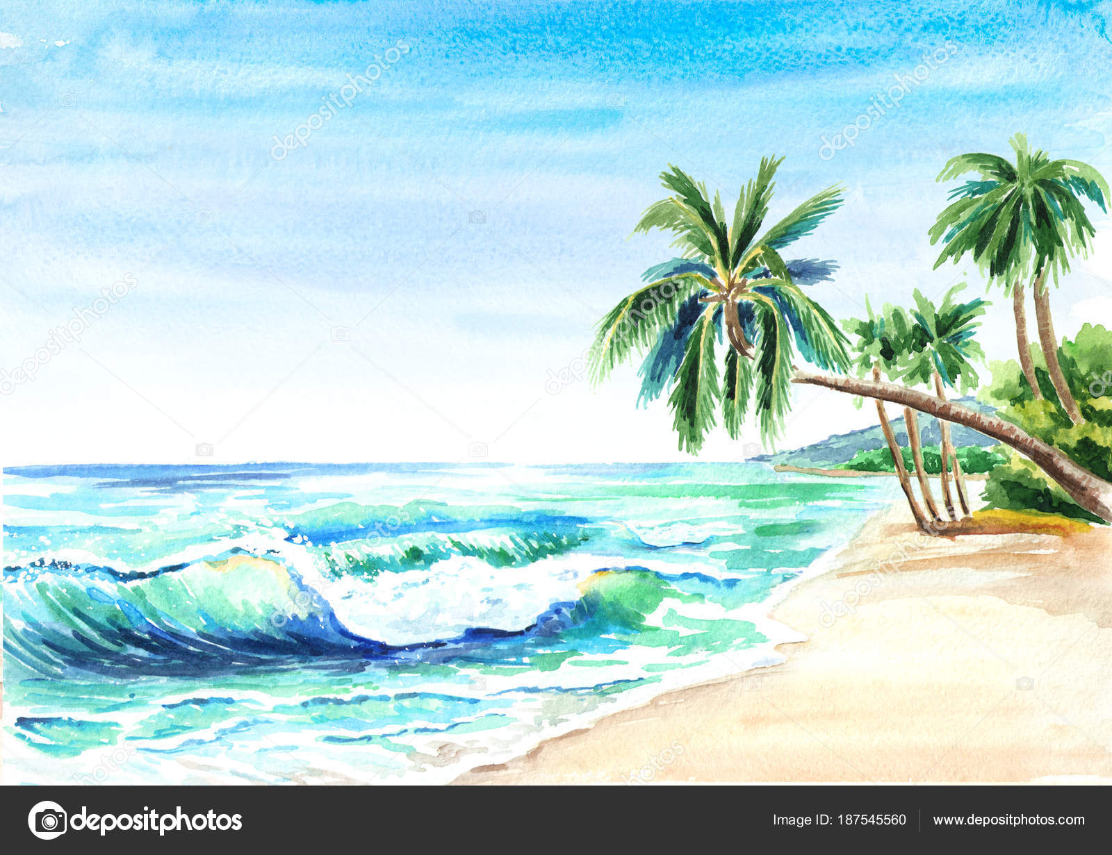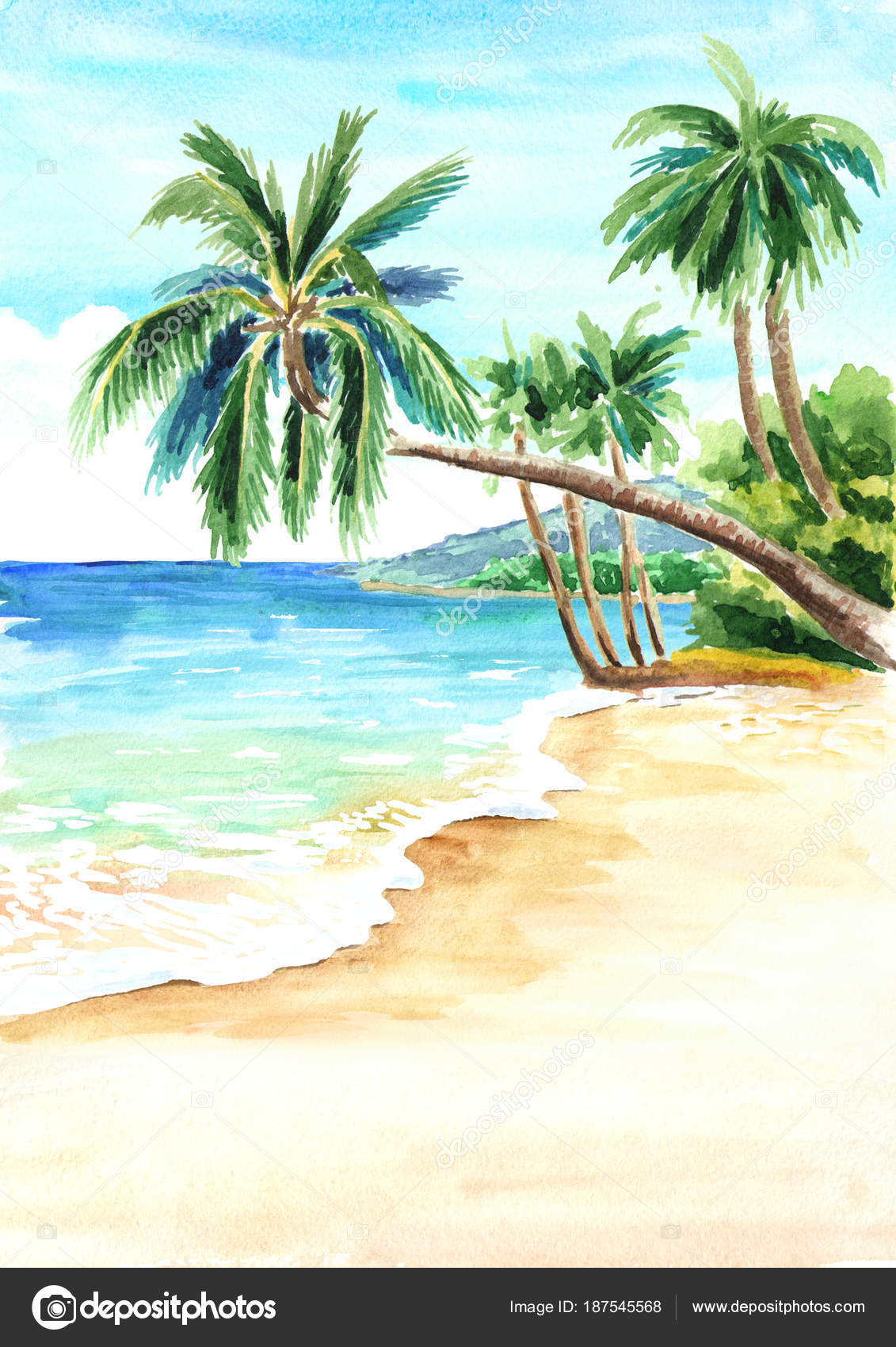 Tropical landscape with sand and waves palm trees and. Paint a landscape of a lush palm tree blue sky and lovely turquoise water in this tropical beach painting class. Sea bird art sailing painting beach sand art ocean wall art sea print. Tropical beach hut watercolor art print by carlin blahnik carlinartwatercolor.