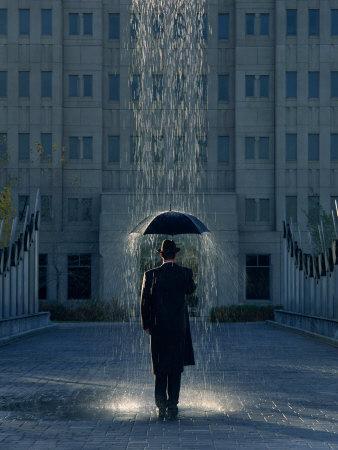 Man With Red Umbrella Standing In The Rain Stock Photo By