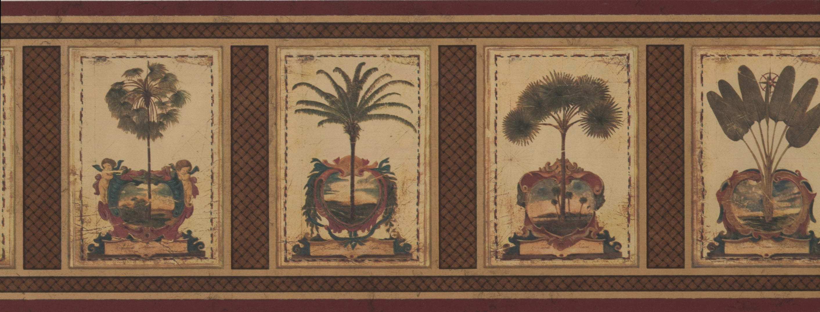 Norwall Palm Trees In Vintage Frames Damask Pattern Prepasted
